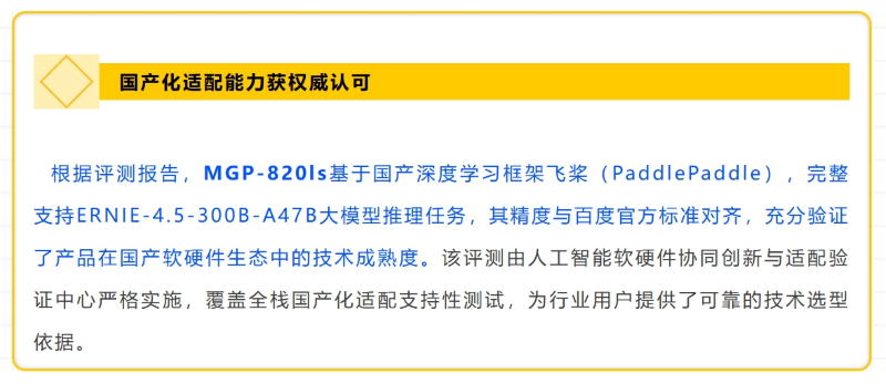 根据评测报告,MGP-820ls基于国产深度学习框架飞桨(PaddlePaddle),完整支持ERNIE-4.5-300B-A47B大模型推理任务,其精度与百度官方标准对齐,充分验证了产品在国产软硬件生态中的技术成熟度。该评测由人工智能软硬件协同创新与适配验证中心严格实施,覆盖全栈国产化适配支持性测试,为行业用户提供了可靠的技术选型依据。